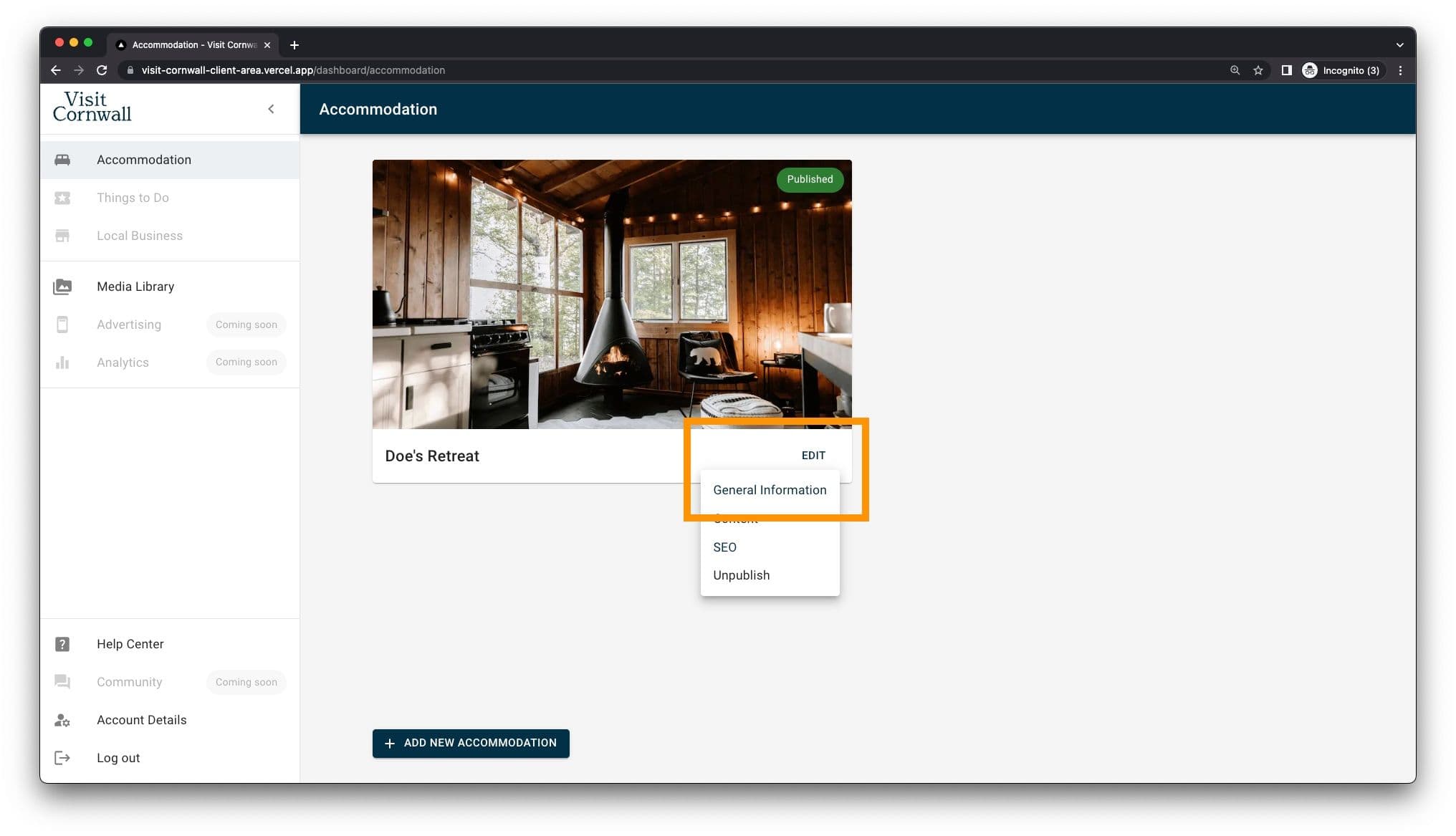 Navigate to the offering type your product sits within, i.e. Accommodation, Things to do, or Local Business. Click on the 'Edit' button and select 'General Information' from the drop down.