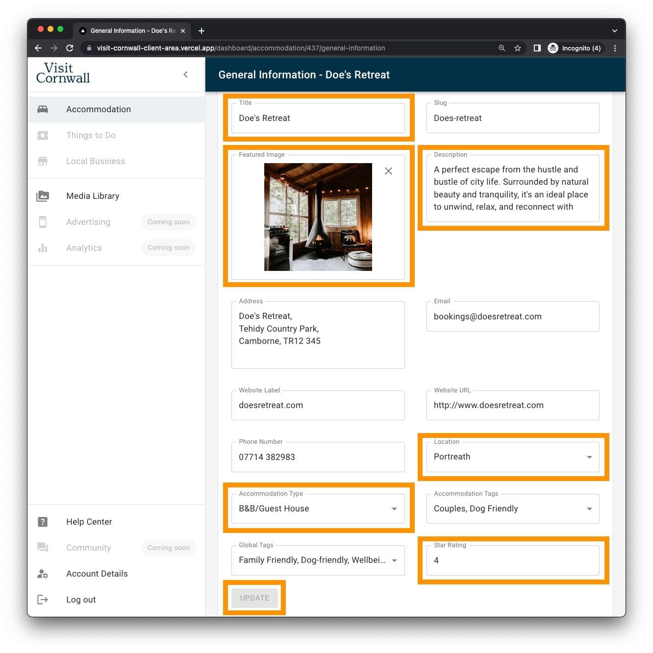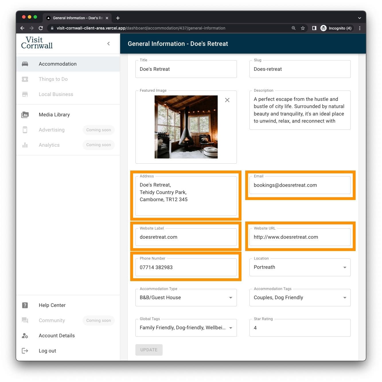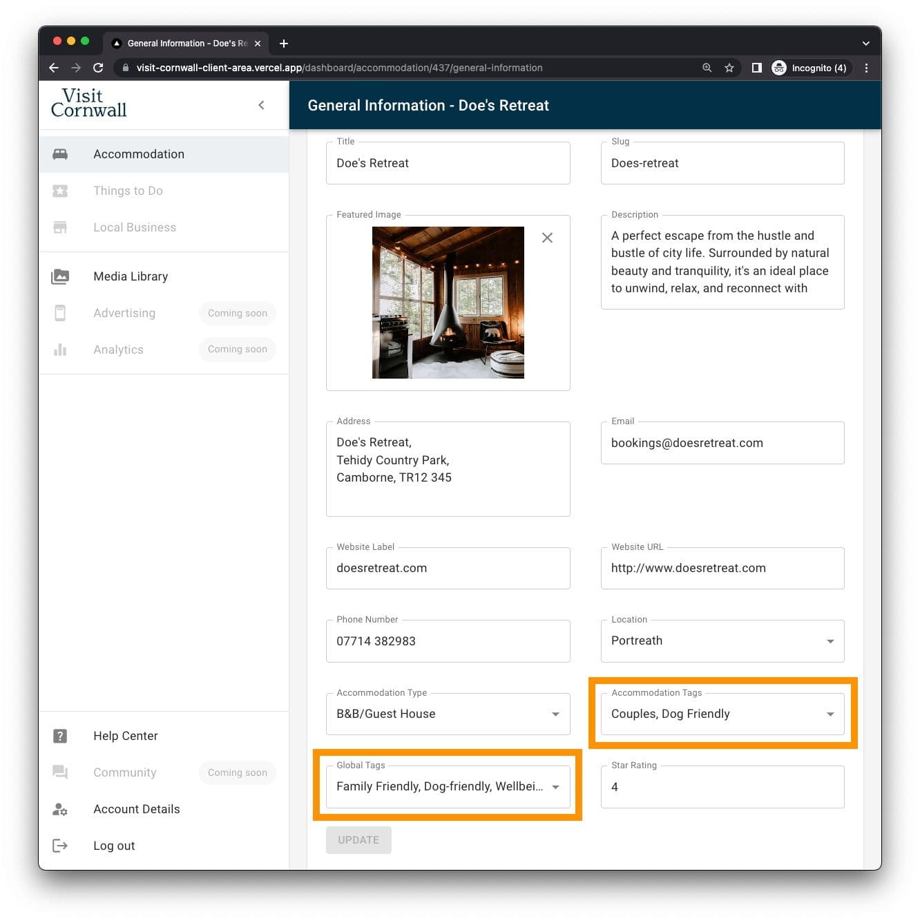 The general information for your offering shouldn't change too often, these fields name your product and give users a little more detail. The fields outlined on the left power the thumbnail information on the right, seen throughout Visit Cornwall, most notably in search results. Remember to click 'update' when you are finshed making any updates.