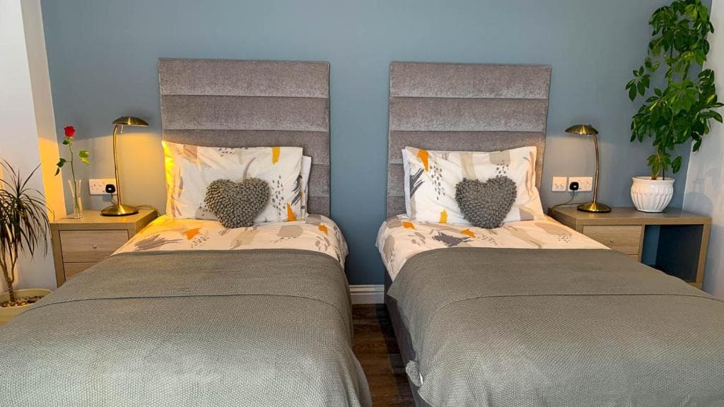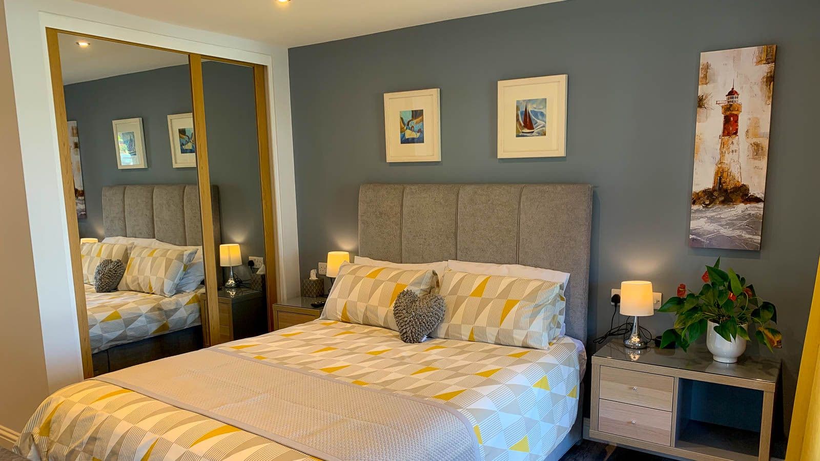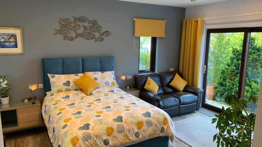 All three of our modern, spacious, comfortable bedrooms (2 kingsize and one super-kingsize/twin) have ensuite bath and/or shower rooms, stunning sea views, minibars, smart TVs, a private door out into the beautiful garden and many other extras to enhance your stay.