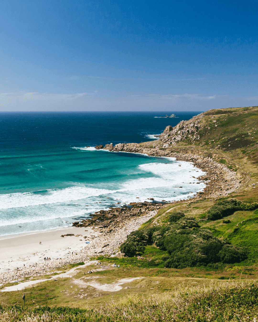 An Area of Outstanding Natural Beauty, this vast stretch of sand and its turquoise waters is surrounded by steep granite cliffs and is only accessible via an arduous path down through the sand dunes. The right hand side of the beach is dominated by the rocky headland of Aire Point, through which passes the South West Coast Path heading towards Cape Cornwall and providing spectacular views from the cliffs, and on fine days the Isles of Scilly.