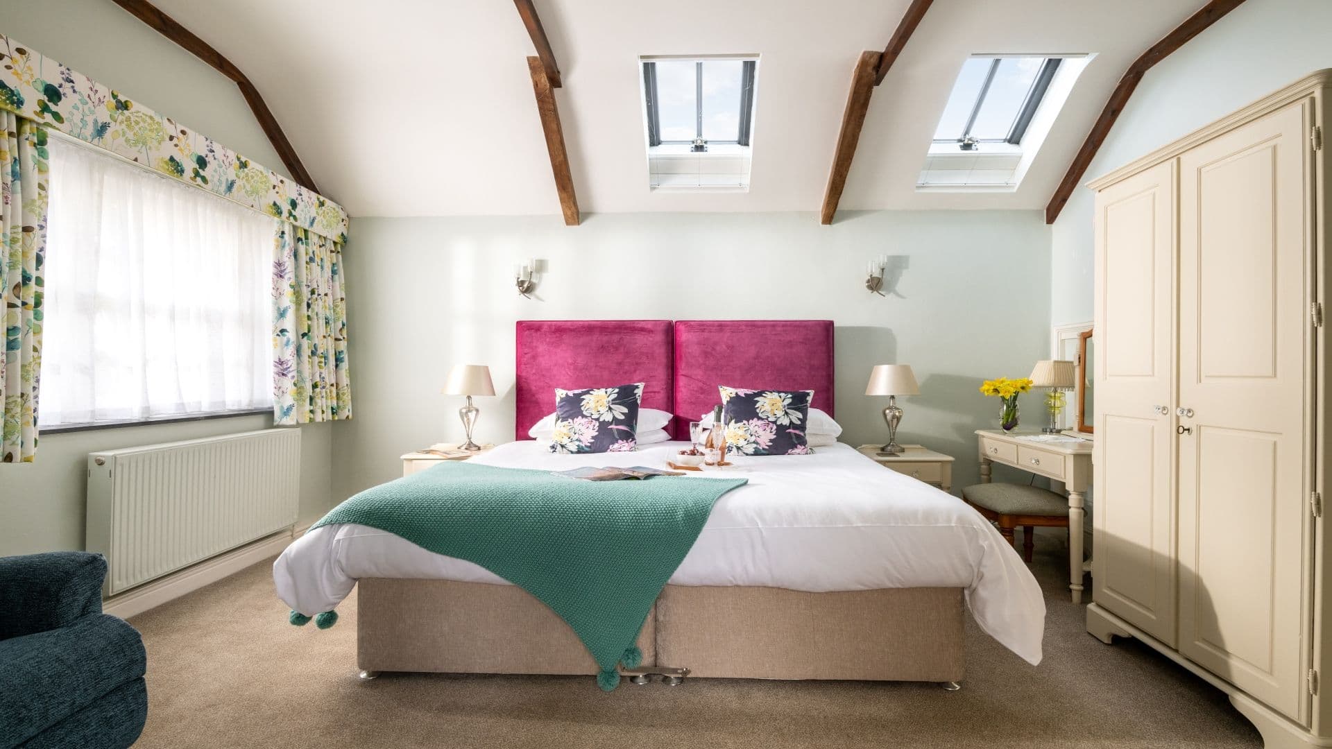 Two spacious ground floor en suite bedroom suites, accessed directly from the farmhouse cobbled courtyard and two attractive bedrooms in the farmhouse, both en suite. One with a double bed the other a twin/double.
