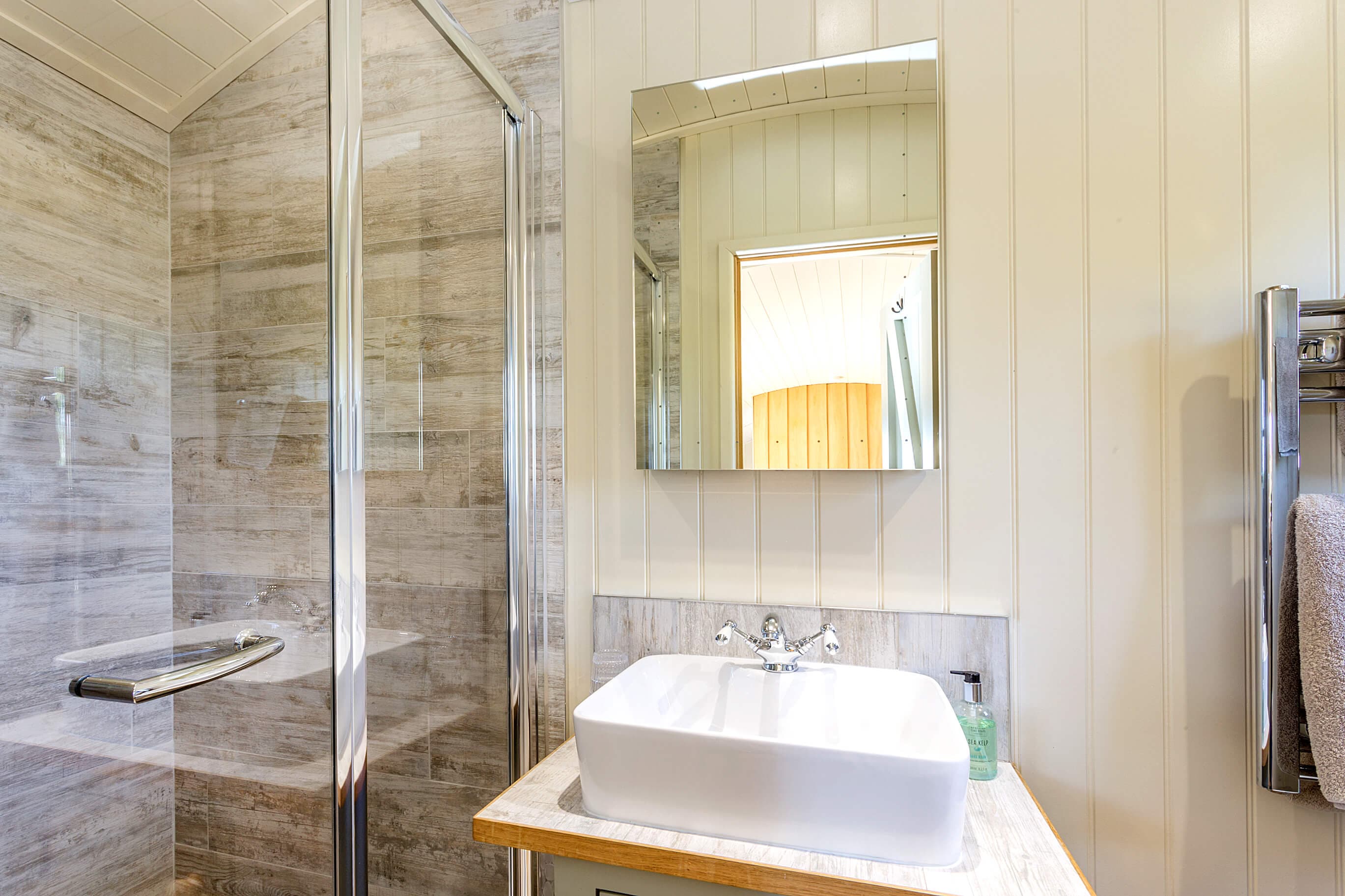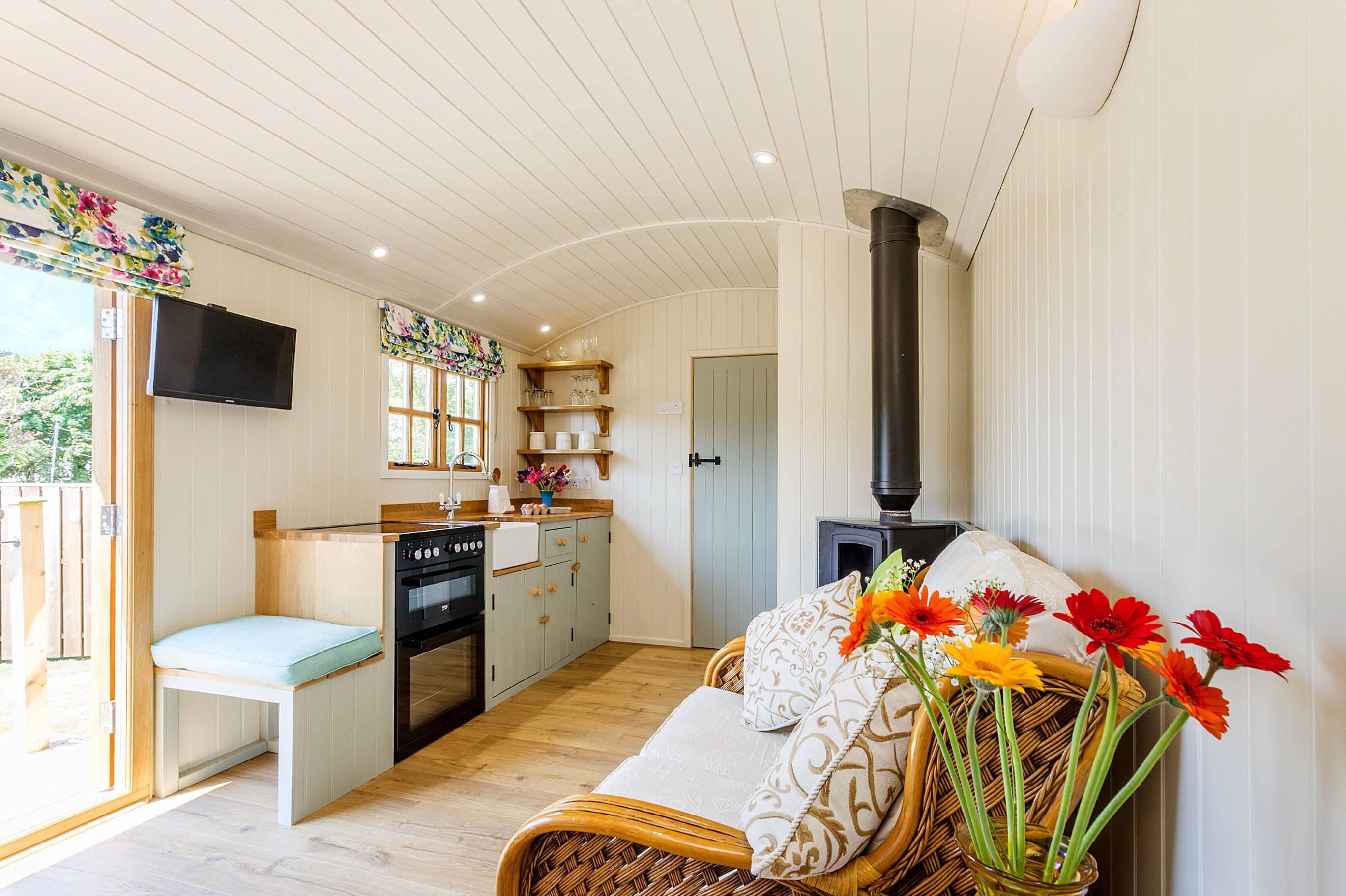Underfloor heating to compliment the log burning stove will provide you with warmth and comfort in the well insulated cabin and there is a fully integrated bathroom with a large drench shower- no going out across the paddock from this Shepherds Hut in the middle of the night!