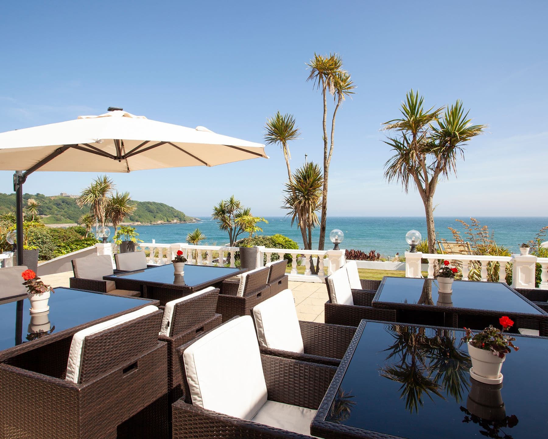 Our seafront location truly is breathtaking. On a sunny morning you could be anywhere in the world with blue skies and sea and palm trees on our lawn. Start your day with breakfast with a view on the terrace. Spend the day at the hotel and relax on a sun lounger or deckchair and enjoy a good book.