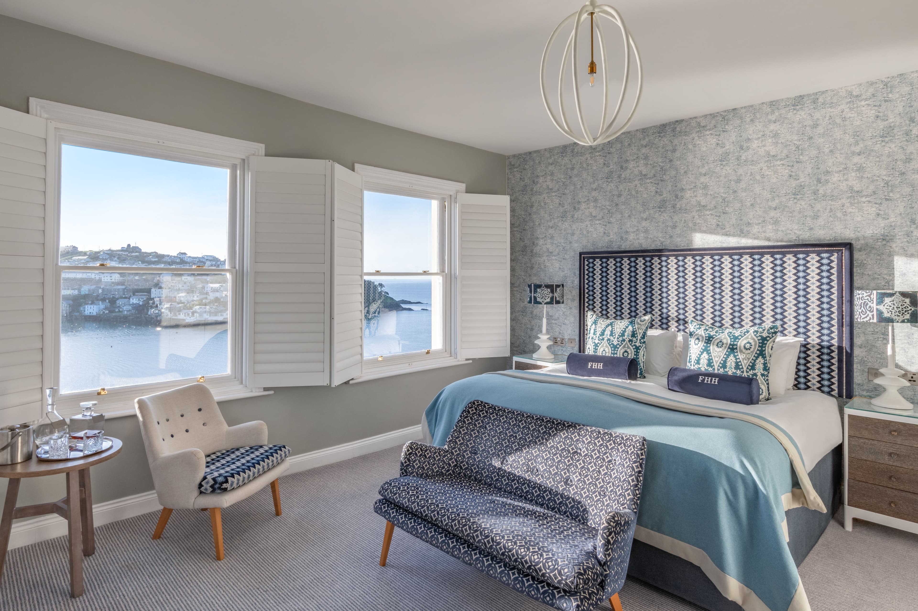 Recently renovated hotel with vibrant interiors, estuary views, wrap-around terrace, harbour-facing rooms, inspired by Fowey’s exotic travel history.