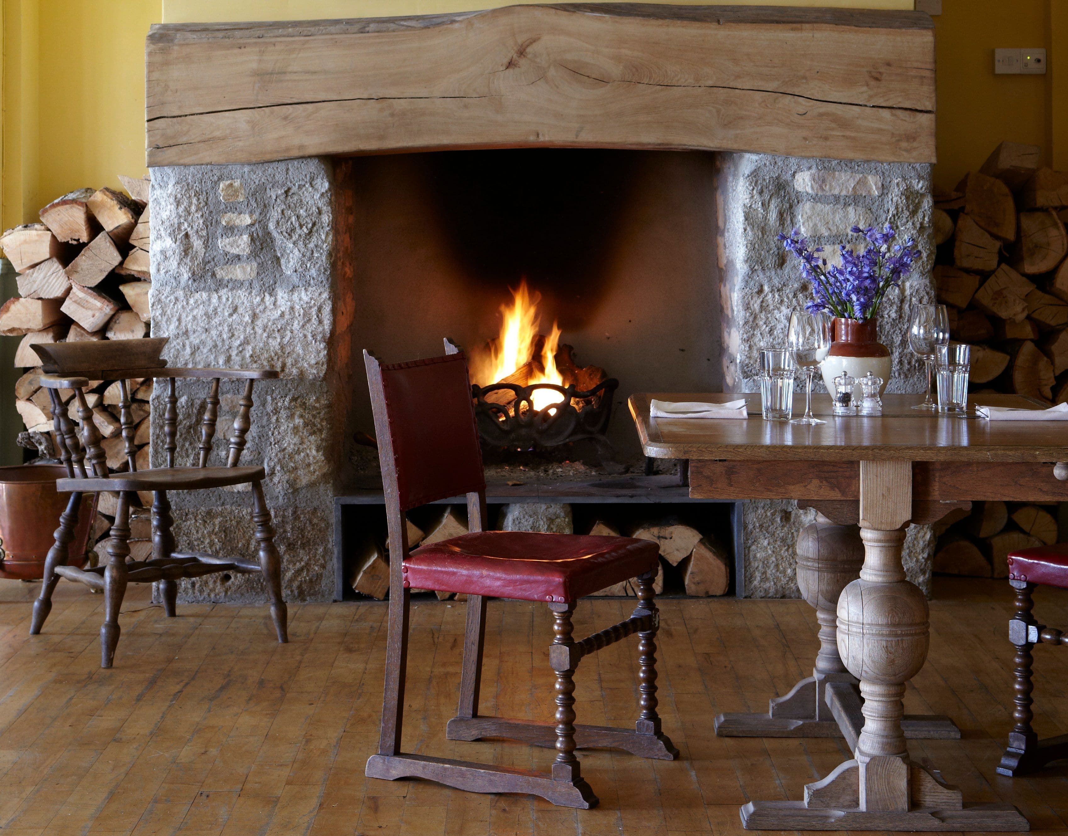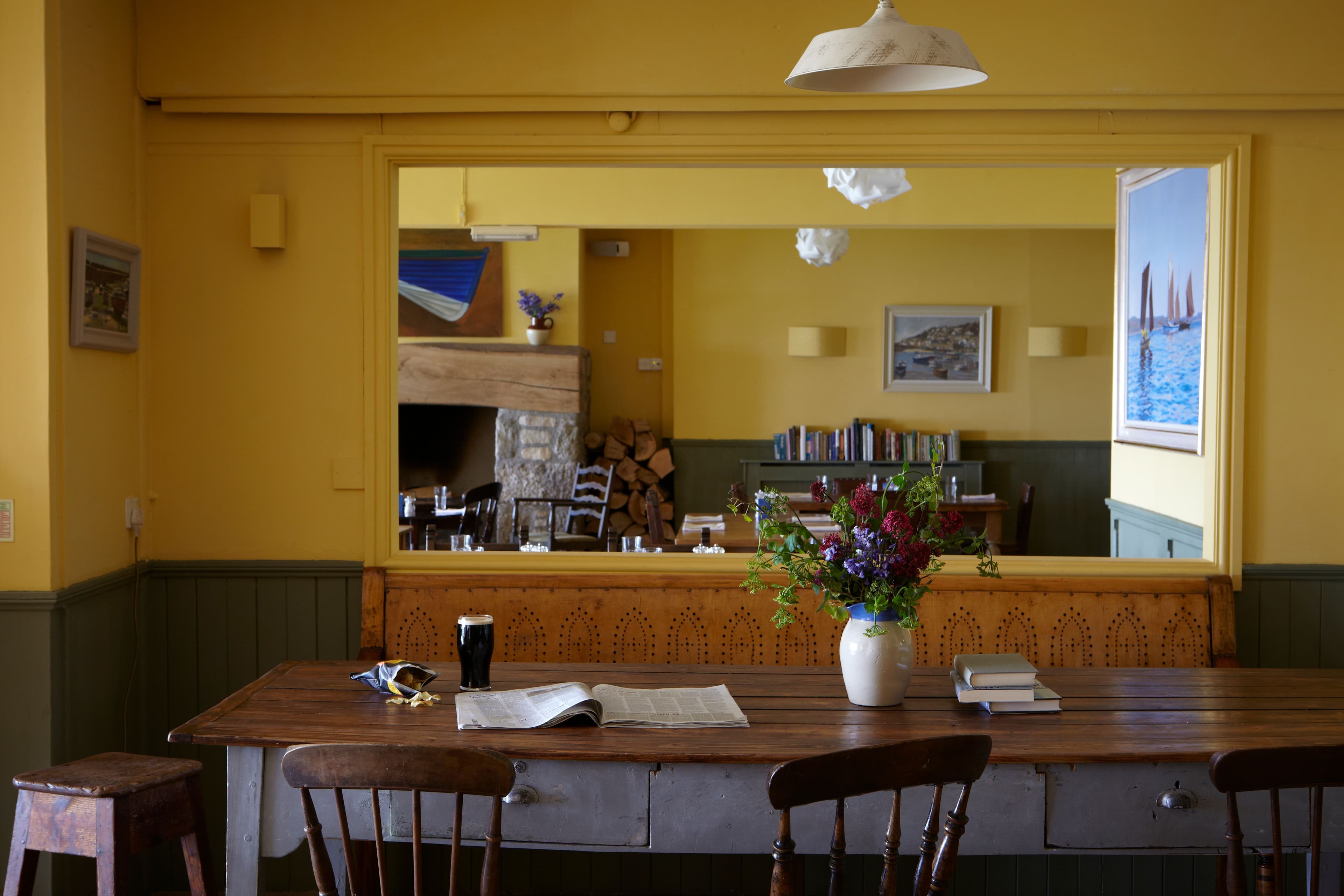 Deep sofas surround coffee tables, oak and distressed pine tables for drinkers and eaters alike and an open fire lit during the autumn and winter. Guests are welcome to eat in the dining room, bar or on the sofas overlooking the terrace and the sea. The walls are hung with the work of the community of artists inspired by this part of West Cornwall with regular temporary exhibitions.