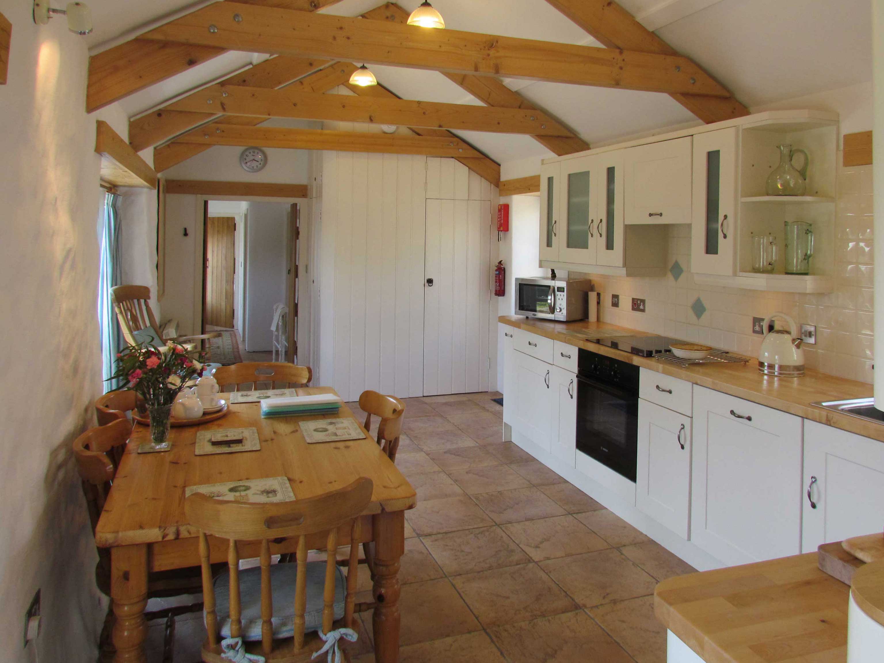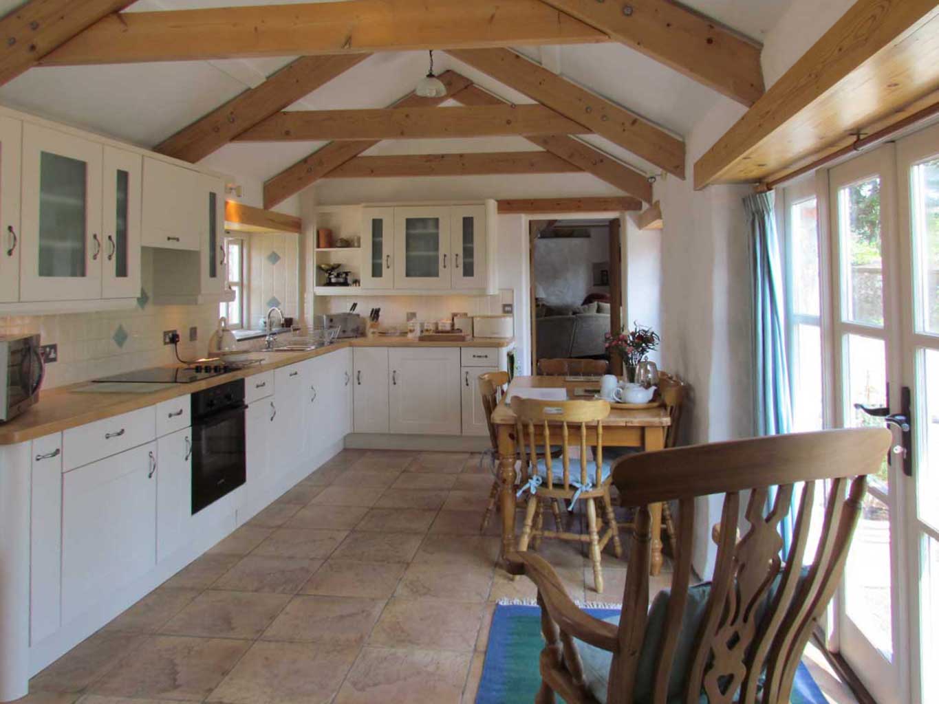 Inside, the cottage provides lots of living space. There is a large kitchen/diner easily seating six while allowing plenty of room to move around and cook. The kitchen has an arched, beamed ceiling and French doors to the front garden courtyard. The sitting room is spacious and light. It has a high, arched, beamed ceiling and five windows as this was originally the old two storey-cottage. There is a wood burning stove to keep you cosy if the weather is cold and wet or in the evenings after a day out in the fresh air. The gallery over part of the sitting room can be used as a quiet sitting space, a play area or an extra bedroom using the 4ft futon as a bed. There is a family bathroom with bath and shower over and also a fully tiled shower room and separate WC with washbasin. All the floors downstairs are tiled. The 3ft stone walls are plastered following the stone contours, painted white, and are warm and dry. The cottage faces south so it is warmed by lots of sunlight on sunny days.