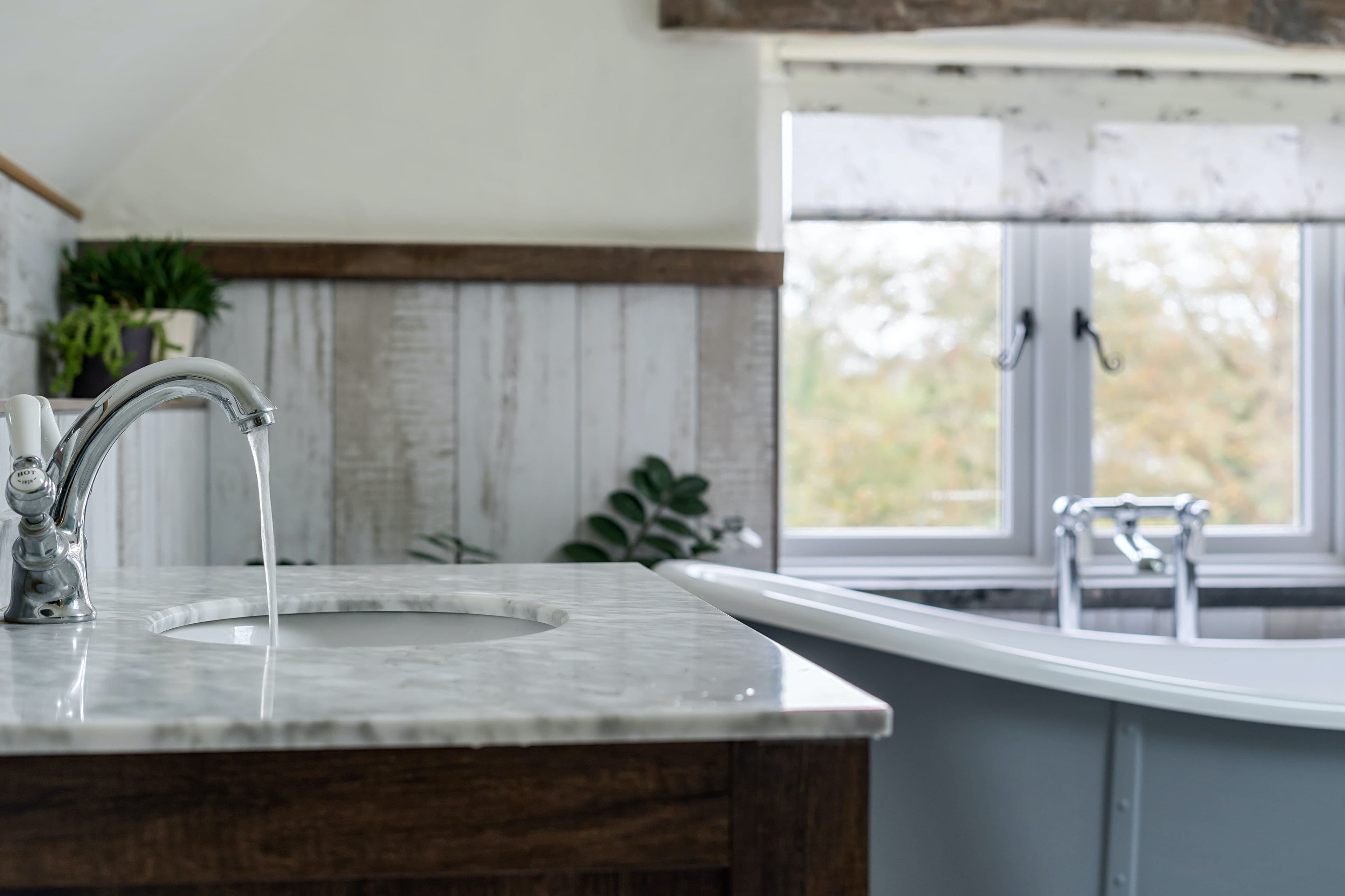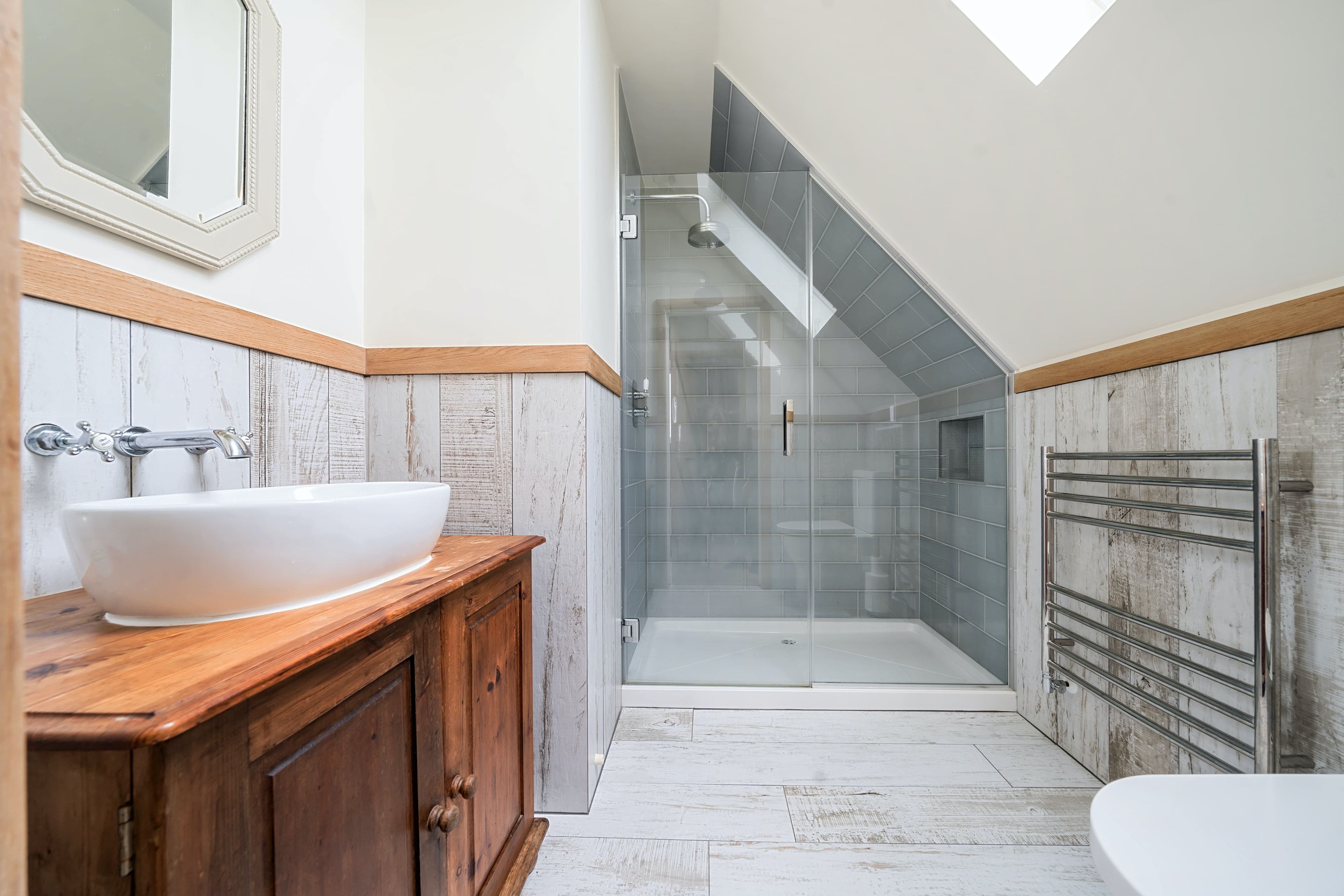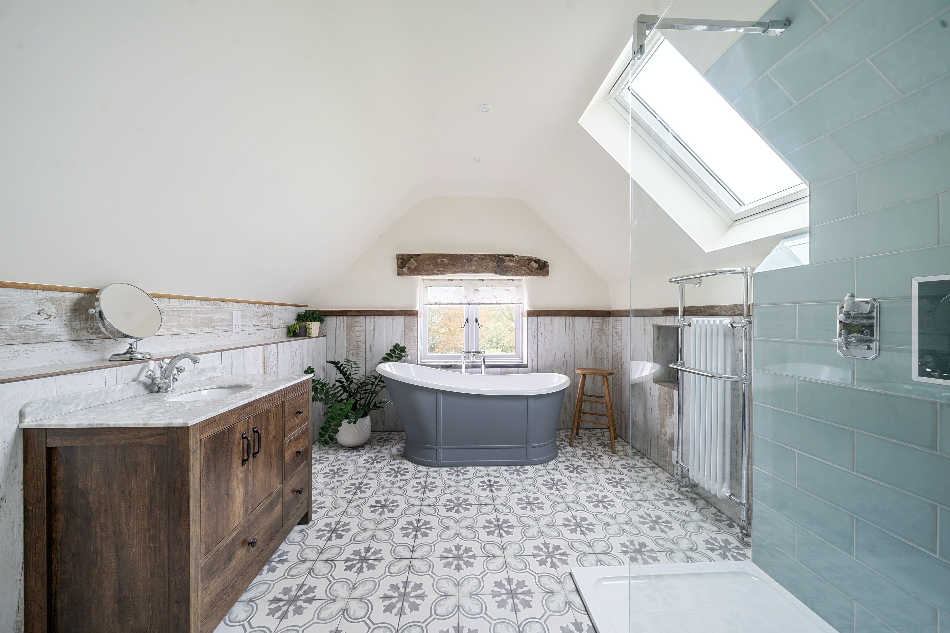 On this floor there is the master bedroom with superking bed. It has a stunning en-suite bathroom with walk-in shower and freestanding slipper bath (with countryside views).