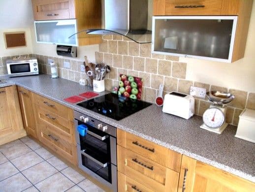 Upstairs is open plan with the kitchen / dining area one end and the sitting area with Sky television opens out onto the balcony with patio furniture the other and has spectacular views stretching to the sea at the front of the property and our open moorland and hill from the back.