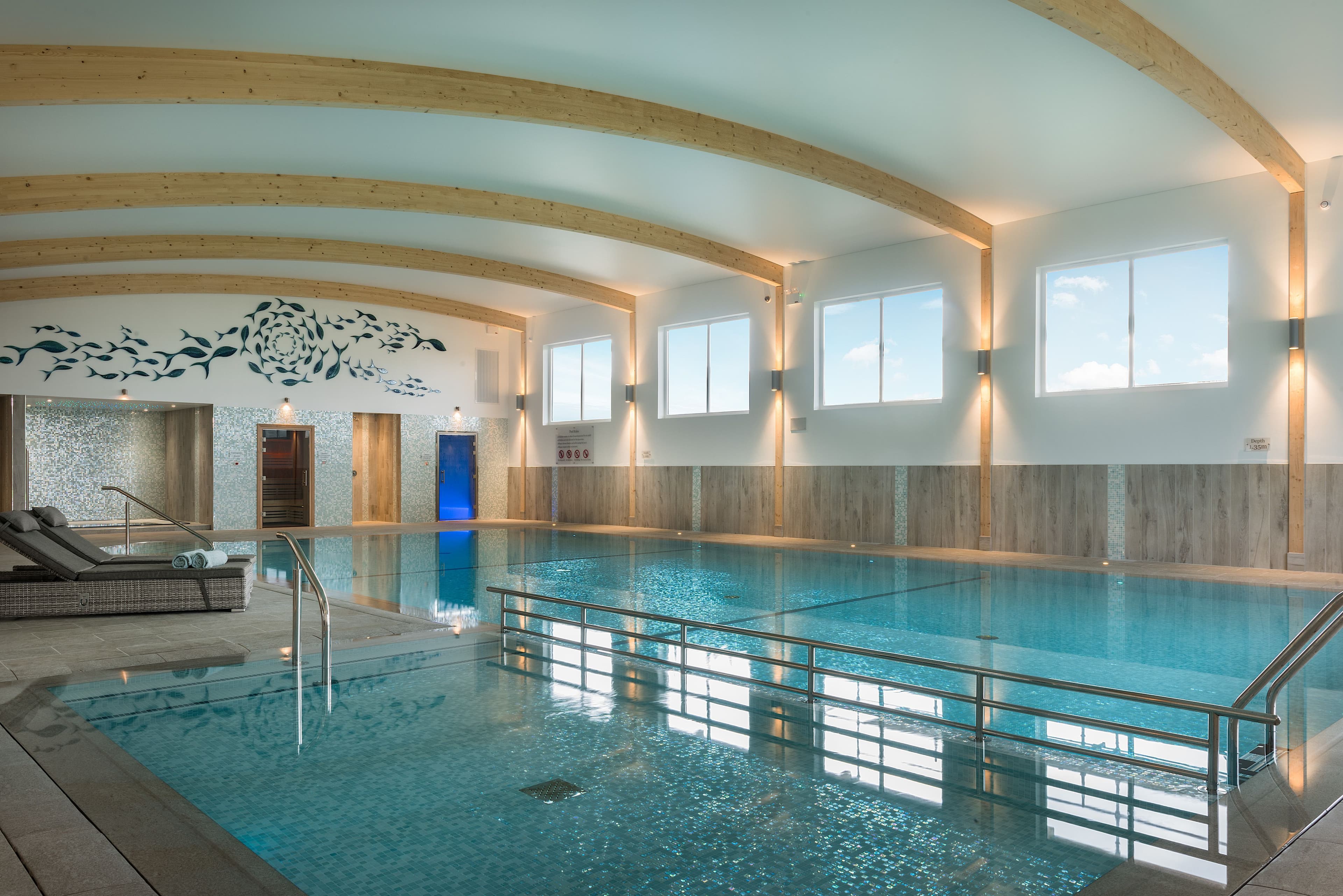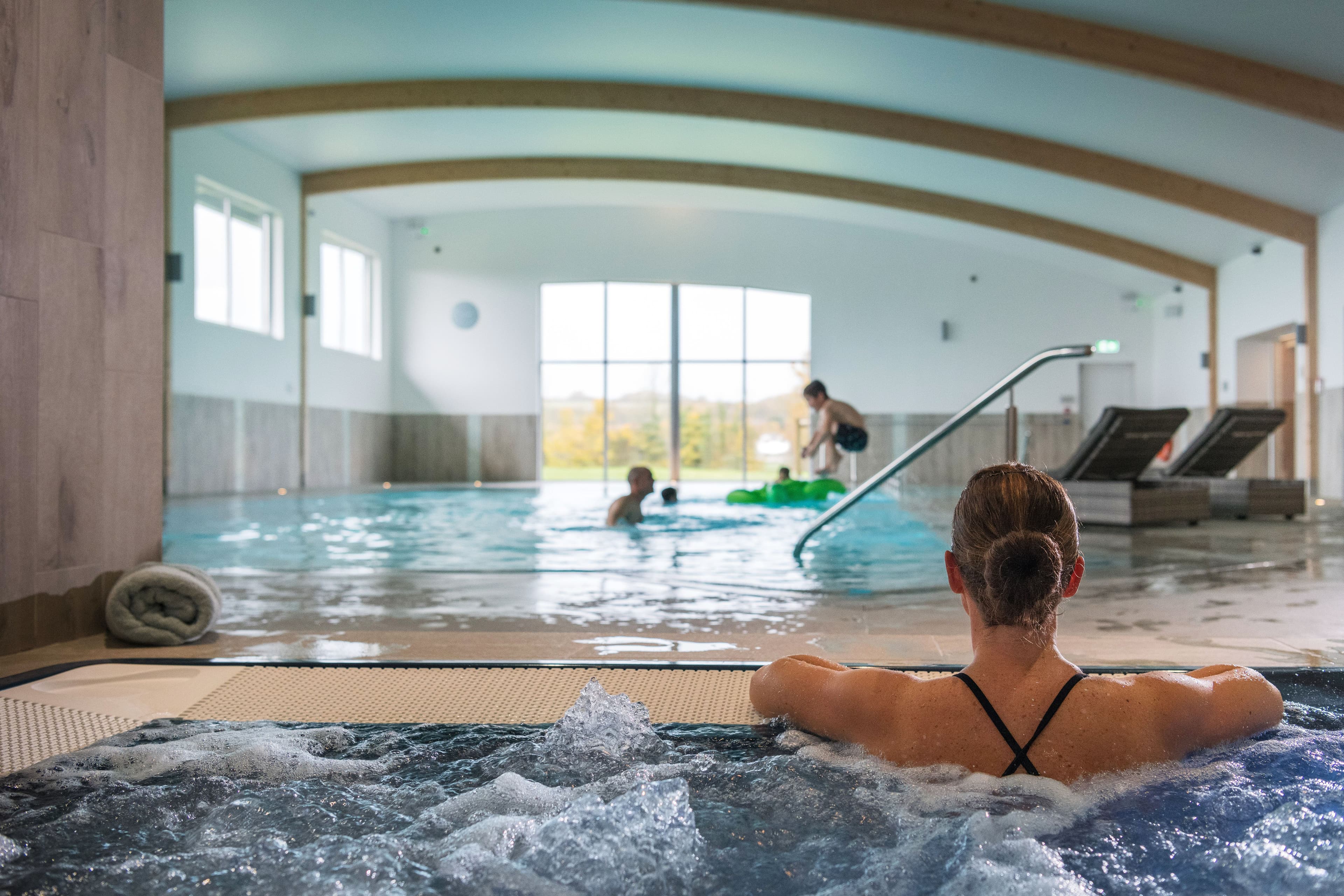 Facilities include a swimming pool complex, indoor and outdoor play areas, tennis courts, farm trail and a bird hide.