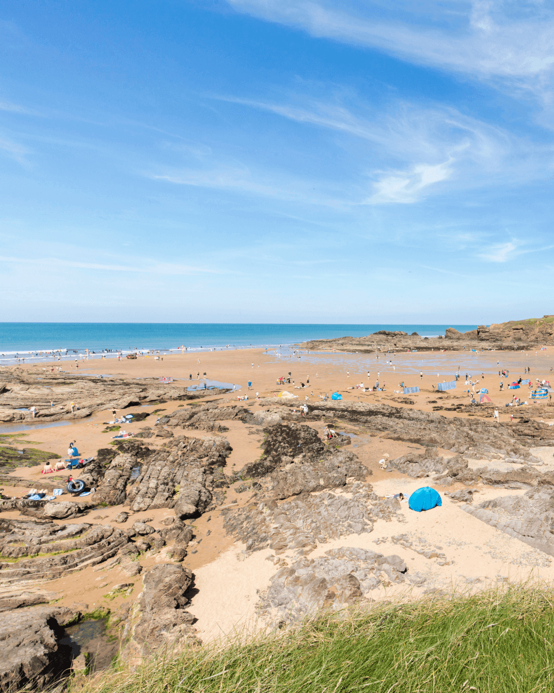 Crooklets Beach on the north coast of Cornwall offers a wide expanse of golden sand that’s exposed at low tide and bordered by rocky outcrops ideal for rock-pooling. As of 2024, Crooklets Beach has been awarded both the Blue Flag and the Seaside Award.