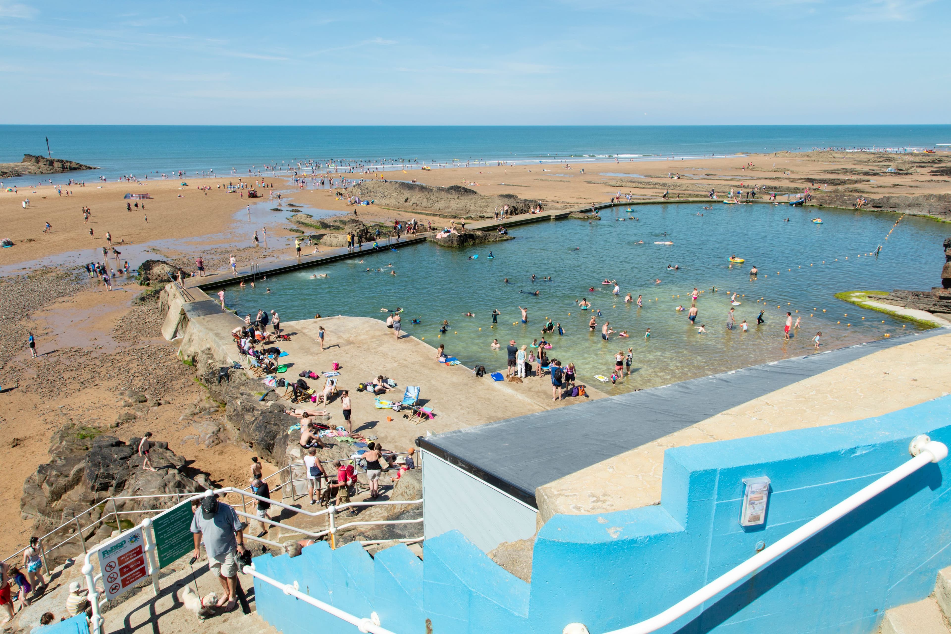 Summerleaze Beach is very popular, mainly because it is less than five minutes’ walk from the centre of Bude. It also has a large sea pool nestled at the foot of the cliffs. Part man-made and part natural, the salt-water pool, cleaned daily by the tide, has enticed swimmers since it opened in 1930.