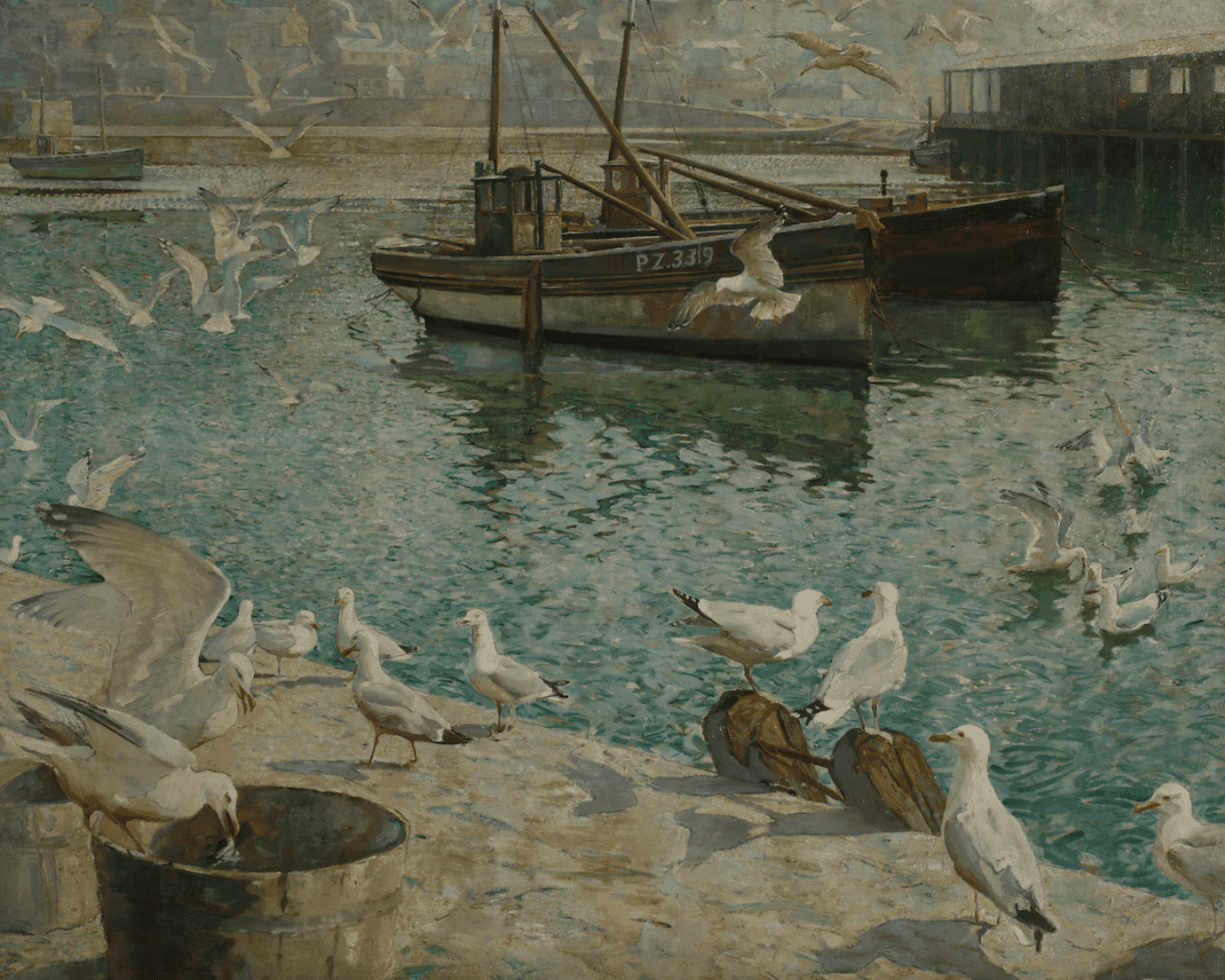 Although the silky black chough is the county bird, the most notable and noisy feathered residents of our coastline are gulls, dipping and swooping around the rocks, snatching food and piercing the air with their calls. Gulls of all shapes and sizes are synonymous with a visit to Cornwall, and a pesky companion for any resident living within a mile of the coast. Paintings of them are also a key feature of the exhibition.