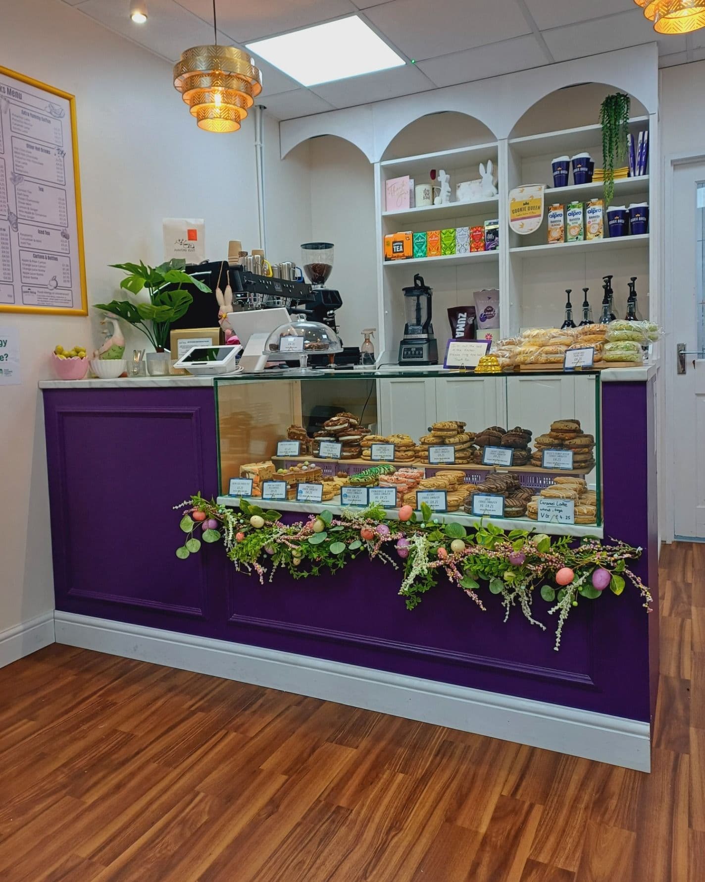 Our shop, located in the heart of Truro, is primarily takeaway, but we’ve added a couple of bistro tables and chairs for those who want to sit and enjoy their treats with a fresh cup of coffee. Speaking of coffee, we’ve partnered with The Roasting Room to serve exceptional quality brews, and we’re expanding our drink menu to include exciting options like Sweet Bird products.