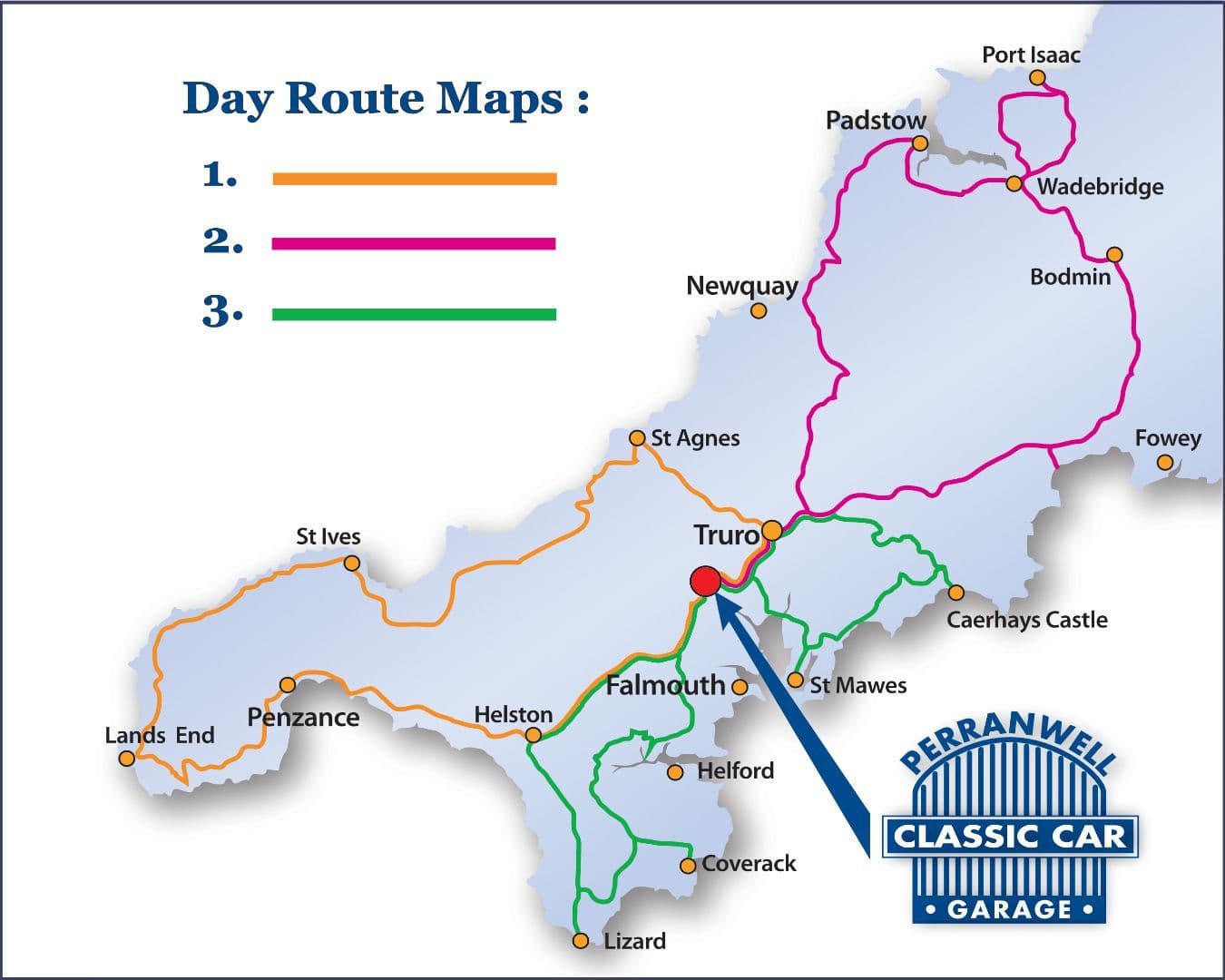 Our central location between Truro and Falmouth provides a great start point for a day out in a Classic Car. We are within easy reach of the North and South Coasts and it is possible to venture down to the furthest westerly point in Cornwall (including Lands End) and return within the day.