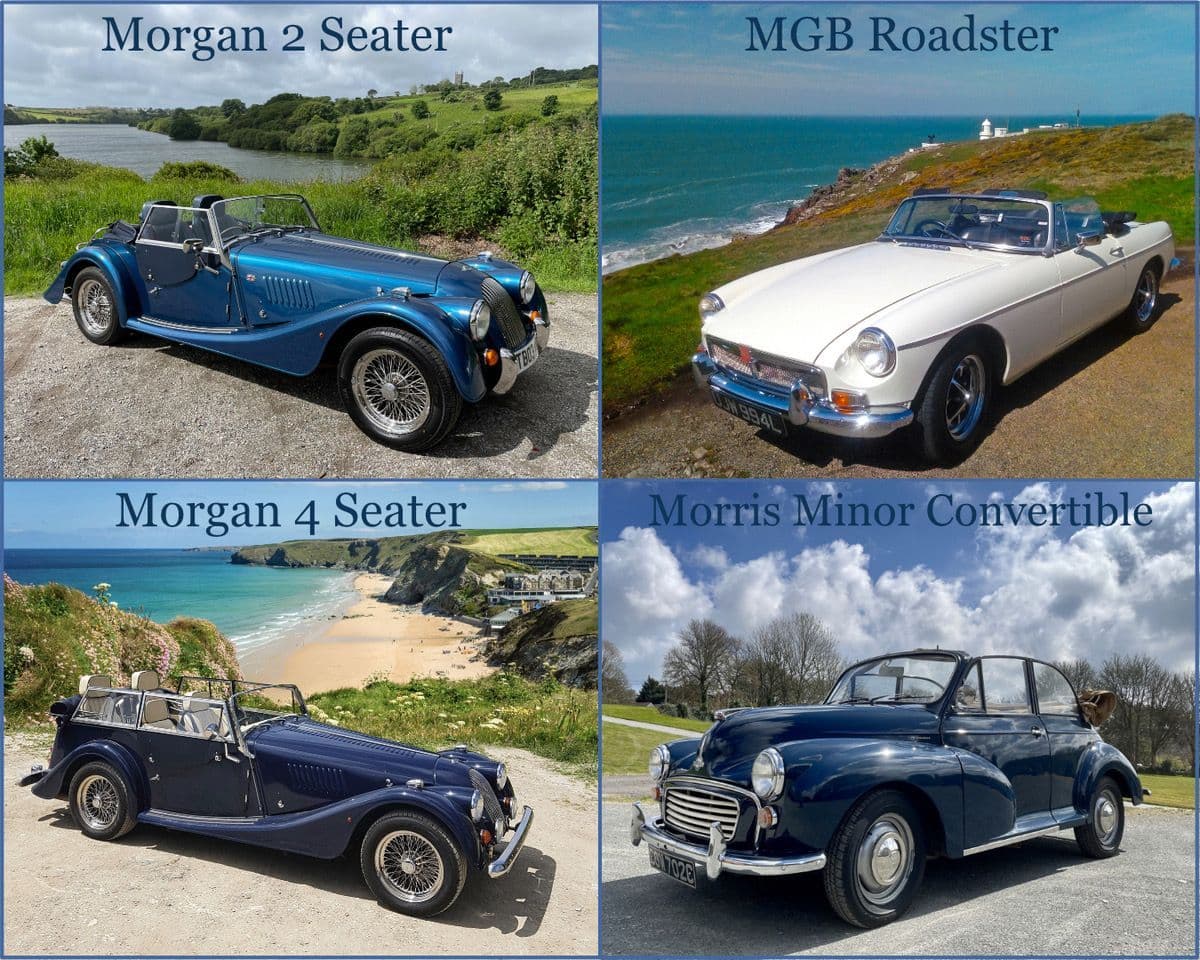 We have both two and four seater Classic cars available, including an MG Roadster, a Morris Minor Convertible and two Morgan sports cars. All cars come with folding hoods and have manual gearboxes.